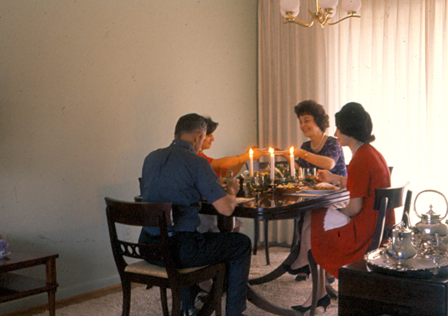 Thanksgiving dinners in my childhood home were small affairs. Only the four of us sat at the table, nibbling on turkey, bread stuffing and pumpkin pie. My father would strategically set up the tripod, attach a shutter release cable to his Kodak Retina, and set the auto timer to ten seconds. After clicking the switch, Dad would race helter skelter to the table while trying not to trip over the tripod, plop himself down in his chair and arrange himself to look as though he had all the time been sitting at the dinner table tucking into his turkey tail. During the several takes it took to get a decent shot, the rest of us were instructed to smile and pass the food, which by this time was probably good and cold.