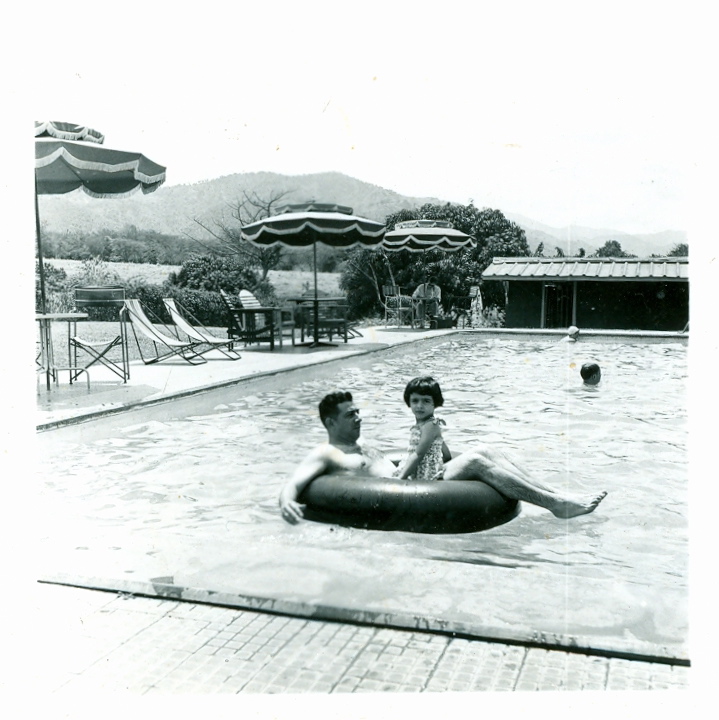 The tube needed to be wet down and cooled off in the swimming pool before it could be climbed into, because it was heavy and black, got hotter than blazes sitting in the sun and reeked of burning rubber. Dad would push the steaming stinking inner tube into the water, hold his breath and tiptoe wincing and shivering down the slippery steps to get himself loaded in and stabilized. Then, not having moved more than about a foot from the edge, he would he row himself over in one short stroke to haul me in for a thrilling ride around the pool.